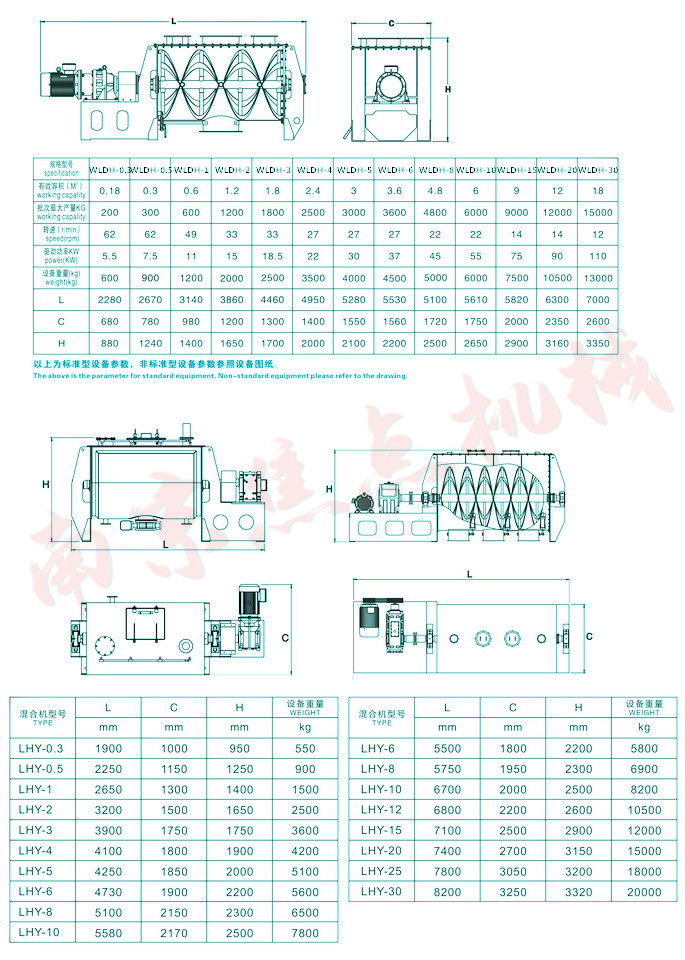 二、工作原理 臥式螺帶混合機(jī)是在攪拌軸上內(nèi)外螺帶的作用下,將物料在筒體范圍內(nèi)進(jìn)行翻動(dòng)。內(nèi)螺帶將物料由中間推向二側(cè),外螺帶將物料由二側(cè)推向中心,來回滲混的物料又在螺帶轉(zhuǎn)動(dòng)下,沿著徑向移動(dòng)、變化、從而形成了對(duì)流循環(huán),由于上述運(yùn)動(dòng)的攪拌,物料在很短時(shí)間內(nèi)獲得快速的均勻混合,因此它是一種用途廣、適應(yīng)性強(qiáng)、效果良好的高效率混合設(shè)備。 三、設(shè)備特點(diǎn) 四、型號(hào)參數(shù)