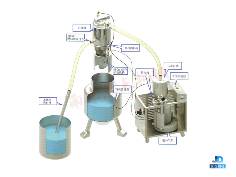 ![]() 一、設(shè)備簡(jiǎn)介 電動(dòng)真空上料機(jī)是在原有的氣動(dòng)式真空上料機(jī)基礎(chǔ)上使用電動(dòng)氣泵代替真空發(fā)生器作為真空源的自動(dòng)上料系統(tǒng)。是國(guó)內(nèi)先進(jìn)、理想、完善的粉狀料、粒狀料、粉粒料混合料的真空輸送設(shè)備。它能自動(dòng)地將各種物料輸送到包裝機(jī)、注塑機(jī)、粉碎機(jī)等設(shè)備的料斗中,也能直接把混合的物料輸送到混合機(jī)(如V型混合機(jī)、二維混合機(jī)、三維混合機(jī)等)中,減輕了工人勞動(dòng)強(qiáng)度,解決了加料時(shí)粉塵外溢等問(wèn)題,是制藥廠、食品廠通過(guò)GMP認(rèn)證、促進(jìn)清潔、文明生產(chǎn)的首選設(shè)備。 二、工作原理 電動(dòng)真空加料機(jī)由電動(dòng)氣泵產(chǎn)生真空即負(fù)壓,這樣真空加料機(jī)將通過(guò)輸料管從儲(chǔ)料倉(cāng)中將物料吸入上料機(jī)料倉(cāng)內(nèi),再經(jīng)過(guò)過(guò)濾器將氣物分離,上料時(shí)間由PCB控制器決定,吸料結(jié)束,氣動(dòng)開(kāi)閉機(jī)構(gòu)將料倉(cāng)門(mén)打開(kāi)將物料放入相關(guān)的設(shè)備中,反吹裝置將反吹吸附在過(guò)濾器上的粉末,將粉末清除掉,然后再關(guān)閉料倉(cāng)門(mén),下一個(gè)循環(huán)開(kāi)始。 電動(dòng)式真空上料機(jī)在放料階段通過(guò)換向閥切斷真空,保證電動(dòng)氣泵的連續(xù)運(yùn)轉(zhuǎn),避免電機(jī)反復(fù)啟停。通過(guò)二次過(guò)濾系統(tǒng)使物料和空氣進(jìn)一步分離,從而延長(zhǎng)電動(dòng)氣泵的使用壽命。 此種上料機(jī)具有:高負(fù)壓、大風(fēng)量的特點(diǎn),尤其適用于重物料、遠(yuǎn)距離、大需求的輸送任務(wù)。 工作原理如下圖: