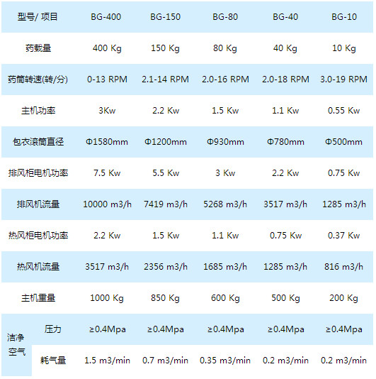 BG高效智能包衣機 一、簡介 包衣機在包衣過程在主機的空間內完成,無粉塵飛散,漿液飛濺,改善了作業(yè)環(huán)境,藥片交叉污染小,符合“GMP”標準;藥片包衣工藝簡單,大幅度縮短了包衣時間,生產效率高;包衣功能齊全,廣泛應用于制藥、生物制品等領域,可為各種片劑、丸劑、等包制各種有機薄膜,水溶薄膜和糖衣(在藥物方面可實現(xiàn)緩、控釋作用),具有效率高、包衣過程自動控制、耗能低、占地小等優(yōu)點。 二、工作原理 片芯在包衣機潔凈密閉的旋轉滾筒內,不停地作復雜軌跡運動,翻轉流暢,交換頻繁,按工藝流程和合理的工藝參數(shù)自動噴灑包衣介質,同時熱風供給在排風和負壓作用下,穿過片芯從底部篩孔排出,使包衣介質在片芯表面快速干燥,形成堅固、致密、光滑的表面薄膜。 三、特點 由PLC和HMI組成的控制系統(tǒng)設計合理,編程靈活,可適應各種不同的制藥工藝需要,工作可靠,性能穩(wěn)定,符合GMP要求。 四、系統(tǒng)配置 1、主機系統(tǒng) a、包衣鍋體 有孔或無孔、容量、材質、拋光情況、正反方螺旋導流方式、配片劑在線溫度控制 b、傳動機構 c、排水槽裝置 d、進排風道、側門、可視防爆燈 2、薄膜衣噴液系統(tǒng) a、噴槍系統(tǒng) b、蠕動泵機構 c、輸液車及攪拌桶機構 3、進風過濾加熱系統(tǒng) a、送風風機 b、空氣過濾器 空氣級別:十萬級,初效、中效和高效過濾器 c、蒸汽/電加熱器 4、排風系統(tǒng) 5、電器自控系統(tǒng)(選配) a、自動化PLC b、打印儲存 c、分級密碼管理 6、清洗 五、型號參數(shù)